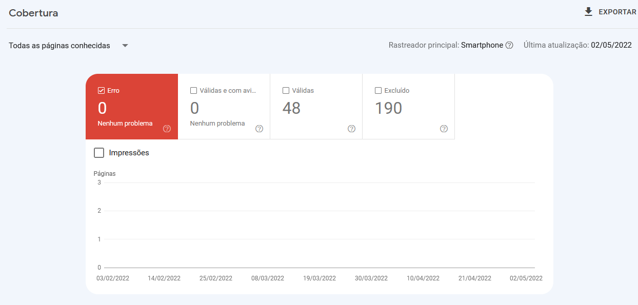 O relatório de cobertura mostra as páginas do seu site foram validadas, que contém avisos e que contém erros: