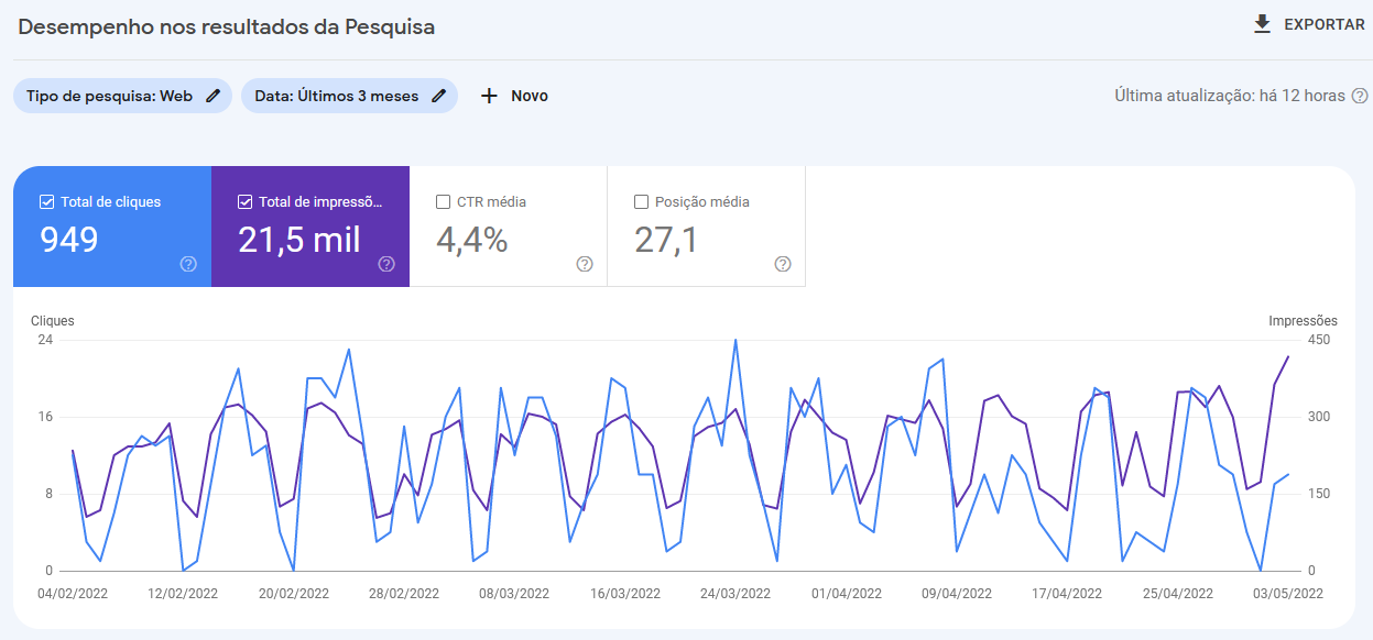 Esse relatório mostra o desempenho do seu site nas pesquisas de forma mais detalhada. As quatro métricas principais são:
