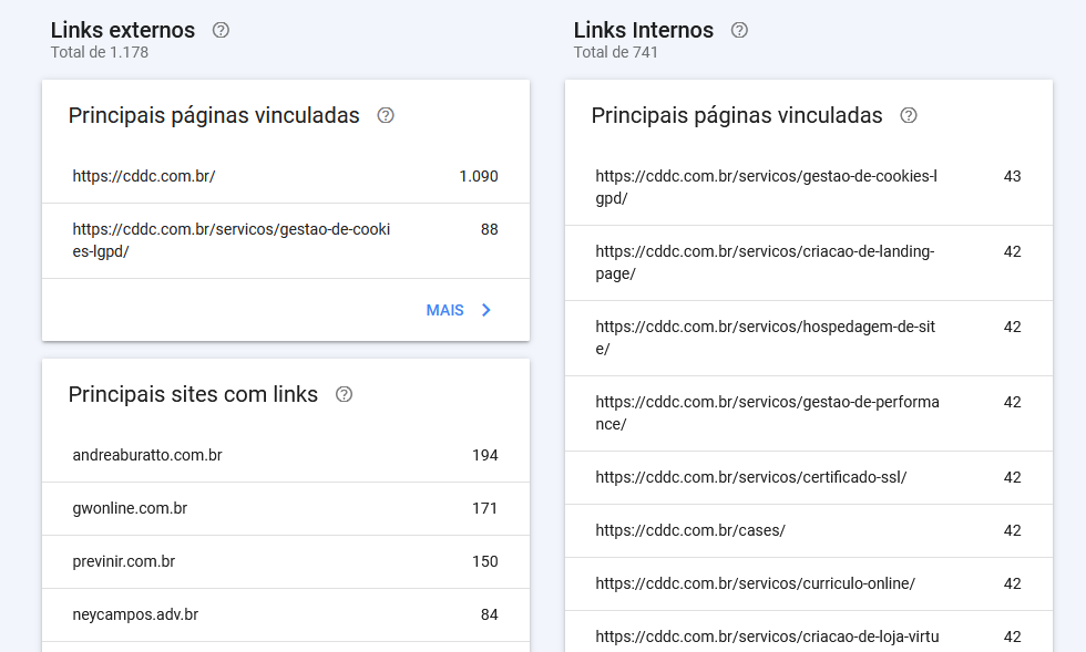 Este relatório exibe uma lista dos sites na web que possuem links direcionando pessoas para o seu site. Este links ajudam que visitantes de outros sites cheguem até a sua página.