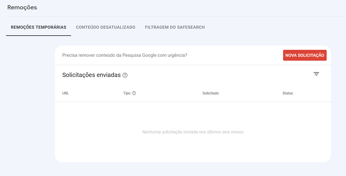 A aba de remoções permite que solicitemos ao Google que retire dos resultados de busca alguma página específica do seu site. Isso pode ser usado no caso de alguma atualização errada, ou publicação de conteúdo indevido no site.