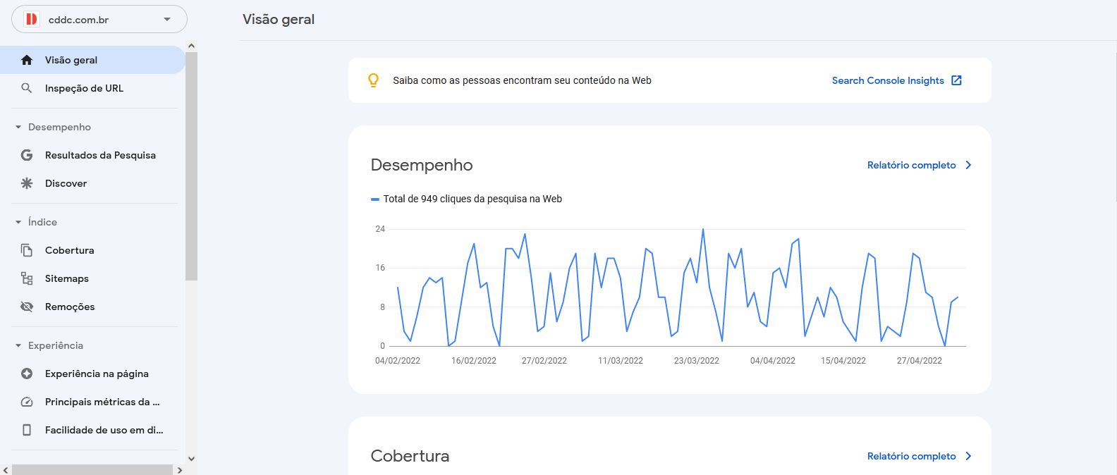 Aqui é possível acompanhar alguns relatórios mais simples sobre a performance do seu site nas buscas do Google, como a quantidade de cliques que seu site recebe no Google, a quantidade de páginas do seu site que o Google exibe em seus resultados, a experiência dos usuários no site, e algumas possíveis melhorias.